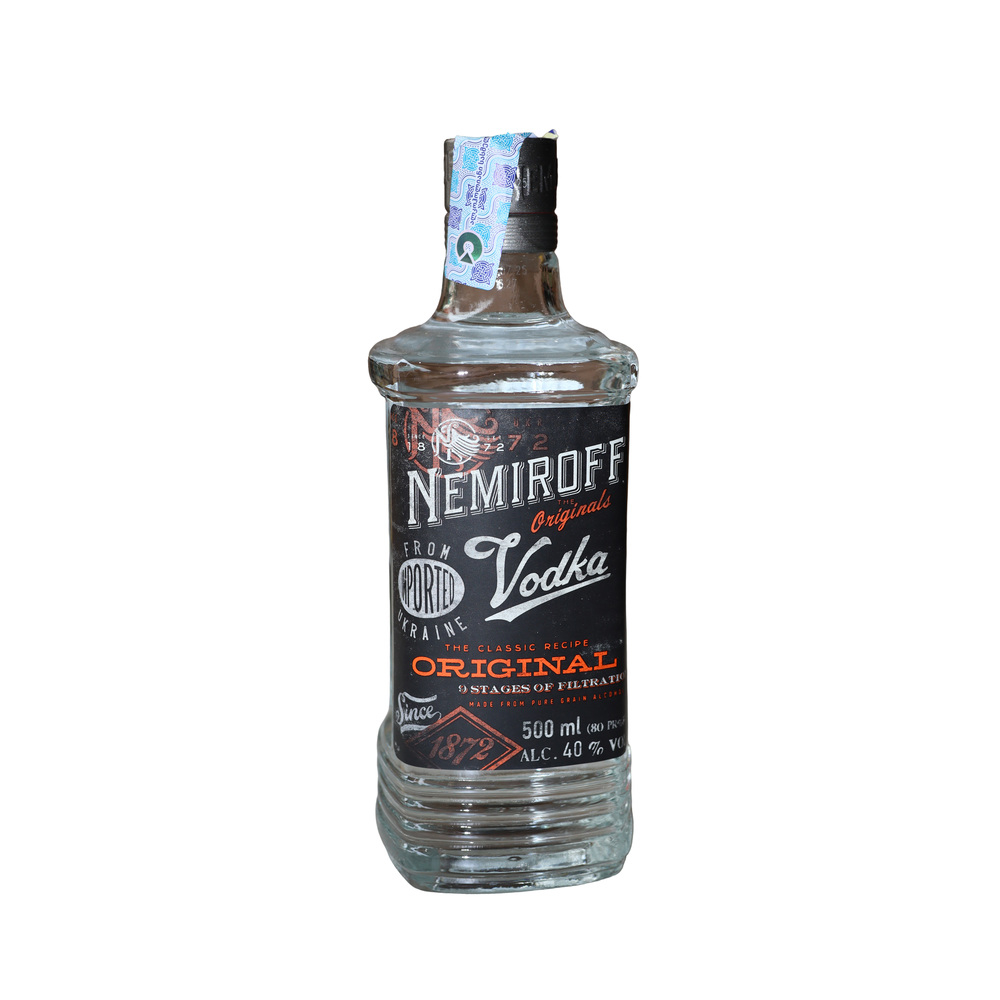 This is Nemiroff Original — vodka with an expressive and slightly bold character. The dark label with copper accents creates a sense of depth and strength, as if the drink hides a rich, confident taste within. The transparent glass emphasizes purity, while the thick base of the bottle adds a feeling of reliability and classic style. The design appears masculine and solid, with a slight vintage mood.