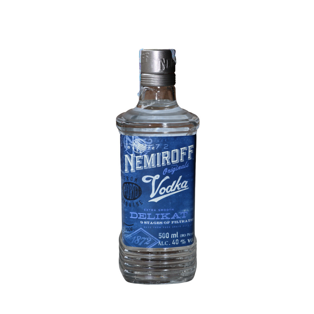 This is Nemiroff Delikat — vodka with a cold elegance and a gentle character. The deep blue color of the label seems to evoke pure water and freshness, while the transparent glass highlights the drink's crystal clarity. The silver cap adds a strict shine, creating a neat and confident image. Everything looks restrained yet stylish — without excess, just purity and balance.
